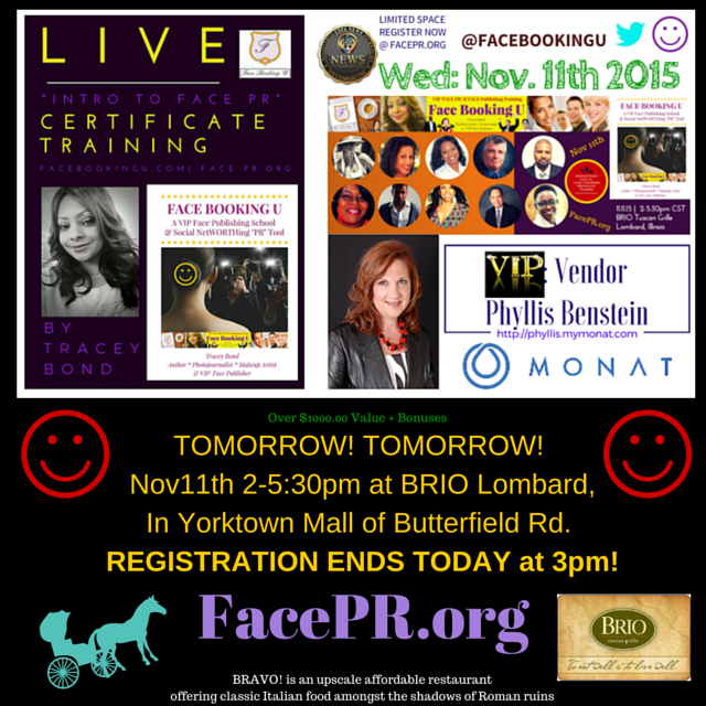 #Tomorrow’s Nov11th #IntroTo #FacePR #PR Industry Registration ENDS TODAY at 3pm CST! Do not miss this #industry #gamechnager w/ VIP #insiders #facespeaksharers #networking happy hour option ( Trainee Gift Bonuses valued at over $1000). FacePR.org http://ow.ly/i/emcUM