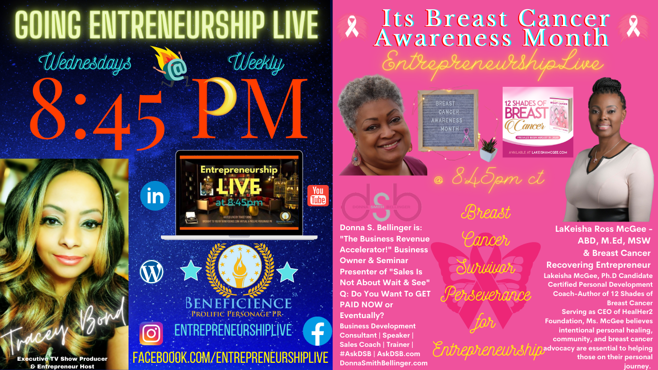 BCAM-MX-The EntrepreneurshipLIVE Show at 8_45pm CT Episode Breast cancer Survivor Perseverance for Entrepreneurship featuring guest entrepreneurs Donna Smith Bellinger & LaKeisha Ross Mcgee
