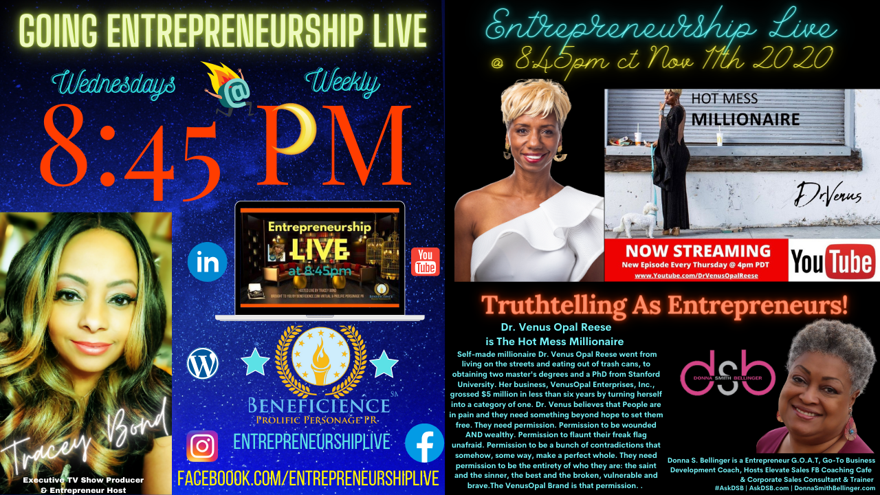 The EntrepreneurshipLIVE Show at 8_45pm CT Episode featuring guest entrepreneurs Dr. Venus Opal Reese – Donna Smith Bellinger TruthTelling As Entrepreneurs! (1)