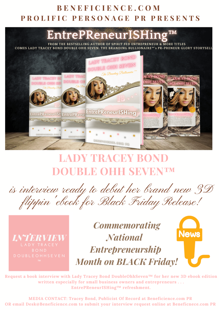 Beneficience.com PR online announces Black Friday book launch for the 3D Flippin' eBook edition of EntrePReneurISHing™ written for entrepreneurs everywhere by Lady Tracey DoubleOhhSeven™ | RSVP online on the EntrePReneurISHing™ Facebook Page
