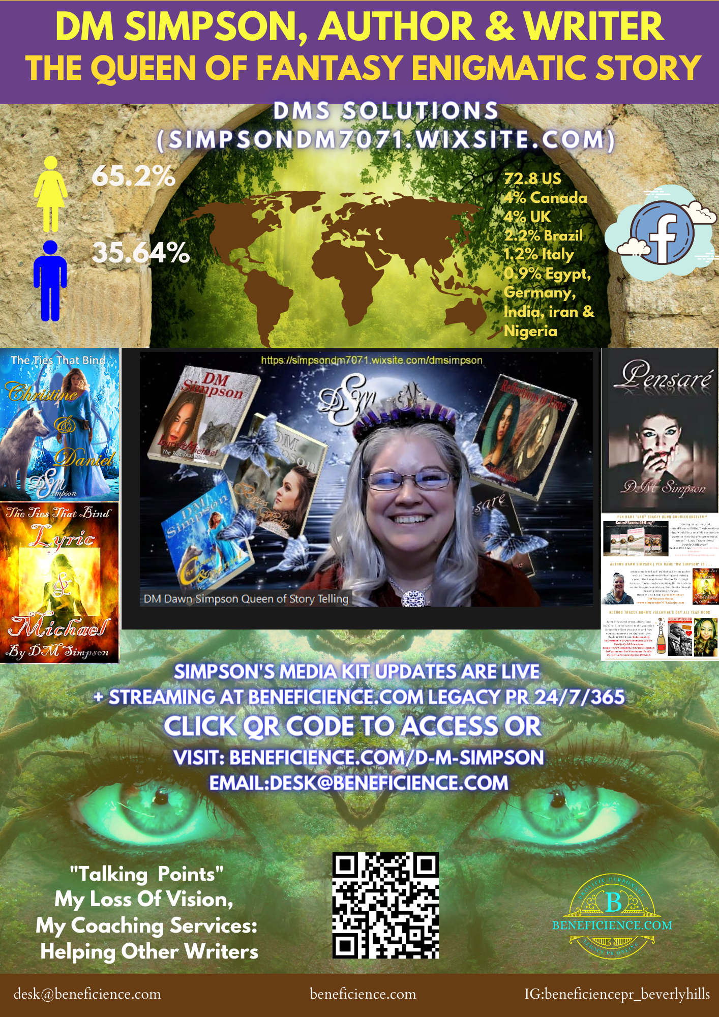 Media Kit and QR Code for Author DM Simpson – The Queen of Fantasy Enigmatic Story – Media Kit at Beneficience.com Legacy PR – Lady Tracey Bond DoubleOHHSeven™ Publicist of Record