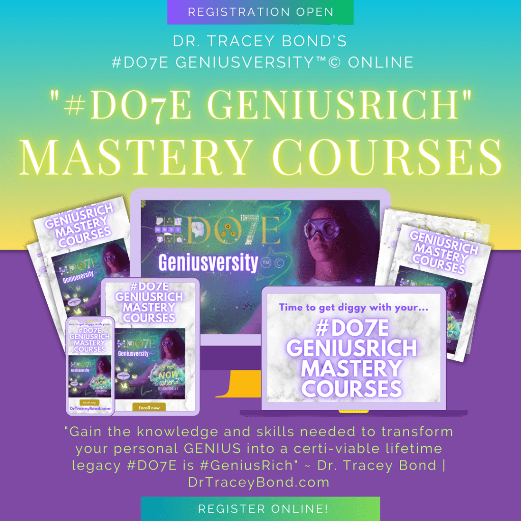Dr. Tracey Bond, Genius Transfoomologist & Director at DO7EGeniusversity™ (more below) says of this phenomenal elevation in her #DO7E #TransformationalGeniusExperience” legacy formation, that: “In a world yearning for personal evolution and heightened awareness, Dr. Tracey Bond introduces #DO7E: #DoubleOHHSevenEffect™, a revolutionary journey to unlock innate potential, explore multidimensional realms of genius, and emerge as certified masters of personal transformation.”